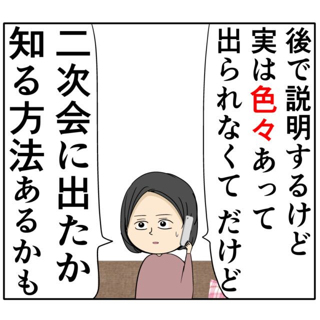 「後で説明するけど、実は色々あって出られなくて。だけど、二次会に出たか知る方法はあるかも」と、良し男さんが二次会に出席したのかどうかを知る方法はあるとすみれさんに伝えました。マキさんという協力者を得て不倫疑惑の証拠集めが前進しそうなすみれさんですね。