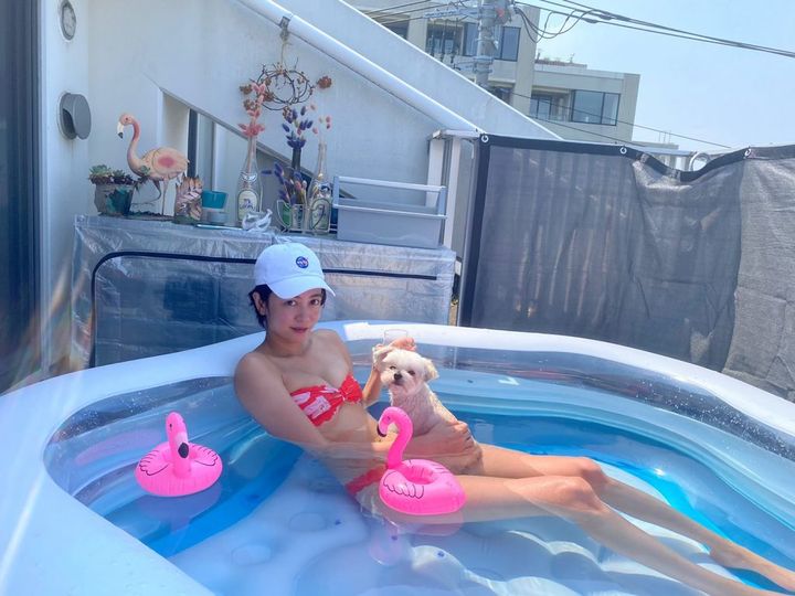 愛犬もダイブするテラスプールからサンセットを望みリラックス