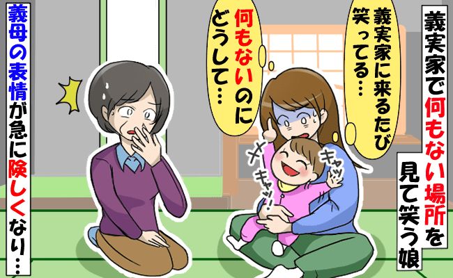 義母の家に行くとよく笑う1歳の娘。義母のことが大好きでうれしくて笑っているのかと思っていましたが、よく見ると義母に向けてではなく、何もない空間を見て笑っているようで……。