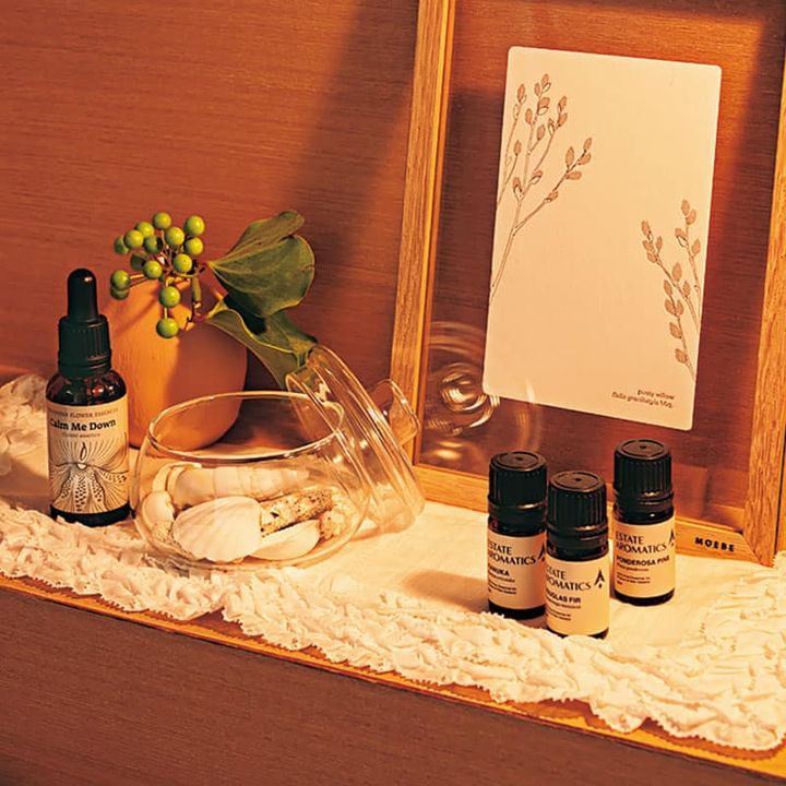 「フィンドホーン社のフラワーエッセンスを体調や気分に合わせて数滴水に落として眠る前に飲んでいます」(Salon de nanadecor)フラワーベース ¥1,200〈GUGU〉木製フレーム(A5サイズ)¥4,000〈MOEBE〉(ともにACTUS)精油各¥2,000(Estate Aromatics/Salon de nanadecor)その他/すべて神田さん私物