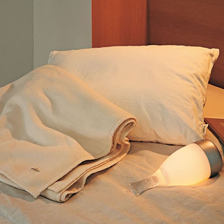 「オーガニックコットンの綿毛布は軽くてふわふわした抜群の肌ざわりで、深く安らかな眠りへと導いてくれます。ダニを一匹も寄せ付けないオーガニックコットン生地を使用した“ダニゼロック„ピローは敏感肌の方にぴったり」(Salon de nanadecor)「簡単に持ち運べるコードレスのランプは生活防水機能付きでバスルームでも使えます。温かみのある光は4段階の調節が可能です」(ACTUS 新宿店)綿毛布¥18,000ピロー¥13,750(ともにnanadecor/Salon de nanadecor)ランプ¥29,000(BOTTLED/ACTUS)