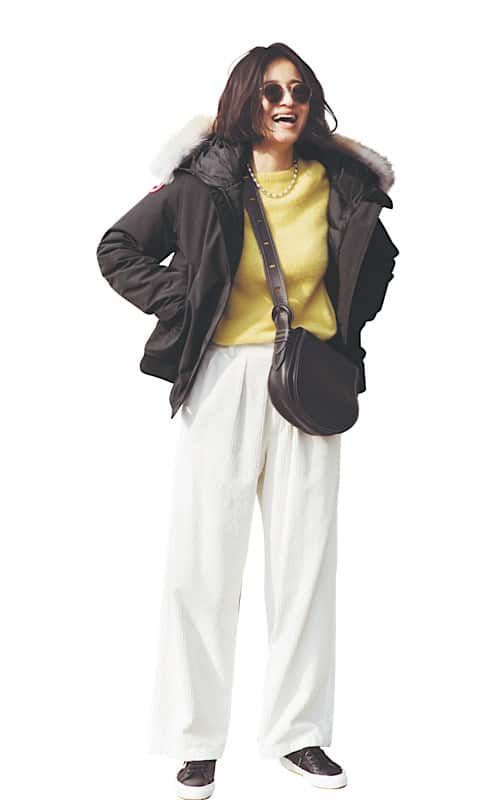 ジャケット¥98,000(カナダグース)ニット¥30,000(ロンハーマン)パンツ¥28,000(ベルウィッチ/アマン)バッグ¥138,000(J&M デヴィッドソン/J&M デヴィッドソン 青山店)スニーカー¥7,200(スペルガ/カメイ・プロアクト)サングラス¥48,000(アイヴァン 7285/アイヴァン 7285 トウキョウ)ネックレス¥14,319(アビステ)