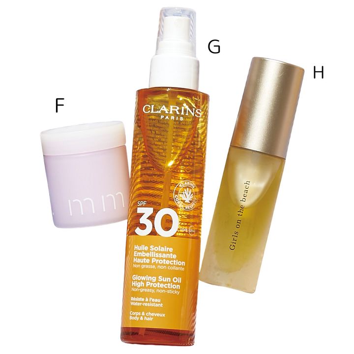 F シアバターで紫外線をブロック。mm クリームバター SPF10/PA+30g¥3,300※サロン専売品(b-ex)G ボディ・ヘア用日焼け止めオイル。グロウイング サン オイル ハイ プロテクション SPF30/PA++++UV耐水性★150ml¥4,400(クラランス)H 環境に配慮したUVオイル。ヘアオイルミスト ガールズオンザビーチ50ml¥3,850(uka)