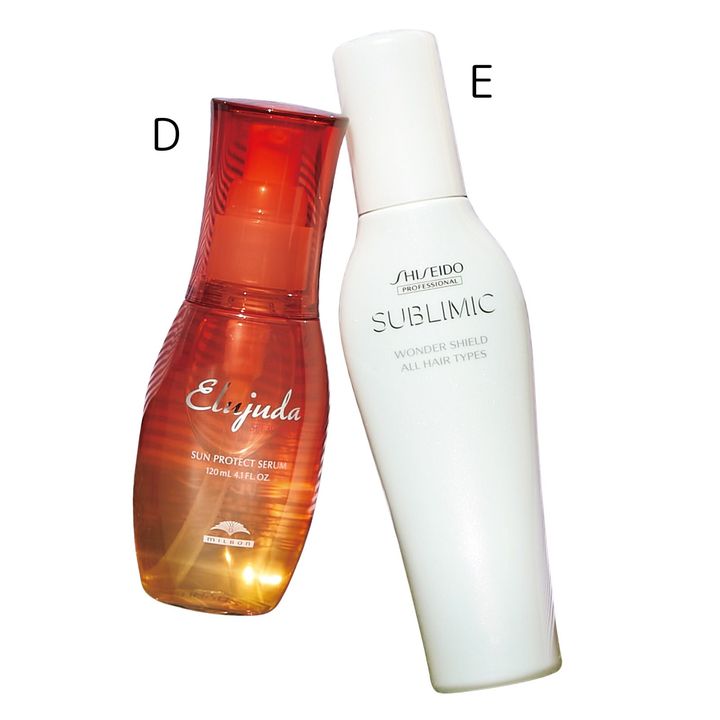 D 日光ダメージから守る洗い流さないトリートメント。エルジューダ サンプロテクト セラムSPF30/PA+++120ml¥3,080※サロン専売品(ミルボン)E 紫外線を含む外的ストレスから髪を保護するスペシャルトリートメント。サブリミックワンダーシールド(サロン・ホームケア用) 125ml¥4,180(資生堂プロフェッショナル)