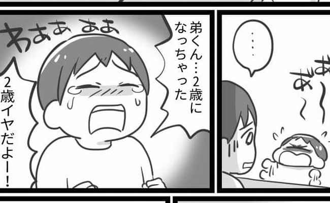 ある日の夕飯どきに次男のイヤイヤが爆発。エプロンをつけてもイヤ! お皿の中に何か入れてもイヤ! 私が途方に暮れていると、突然長男が「○○くん(弟)、もう2歳になっちゃったー! 2歳やだ!」と大泣きしたのです。