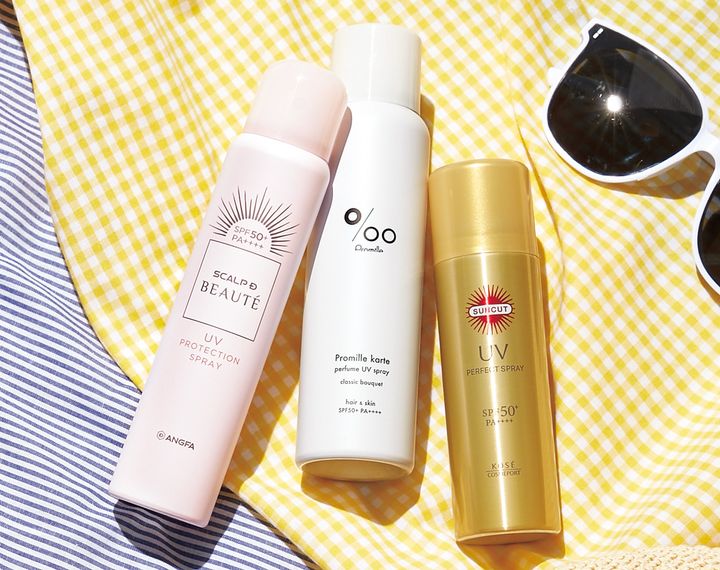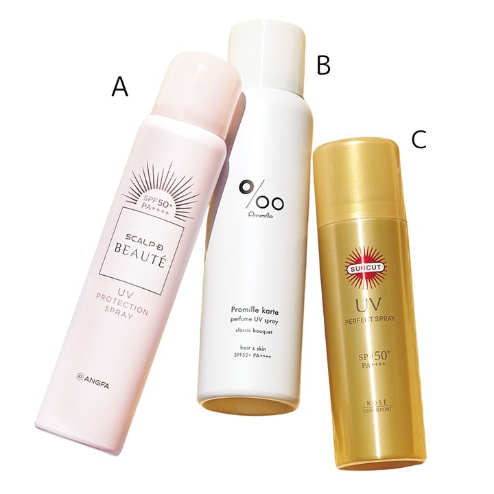 A シリカパウダーでトップふんわり。スカルプD ボーテ UVスプレーSPF50+/PA++++¥2,750(アンファー)B 潤いとツヤをプラス。プロミルカルテ パフューム UV スプレーSPF50+/PA++++80g¥1,980(NAKAGAWA)C 安心のスーパーウォータープルーフ。サンカット®パーフェクトUVスプレーSPF50+・PA++++耐水性★★60g¥798(コーセーコスメレポート)