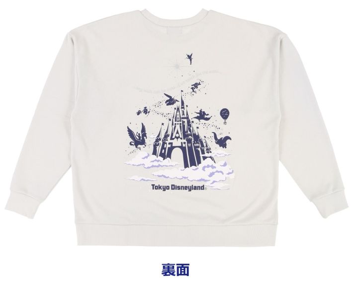 バックにシンデレラ城とキャラクターたちがデザインされたトレーナー。全面の胸元にはティンカー・ベルのシルエットも。