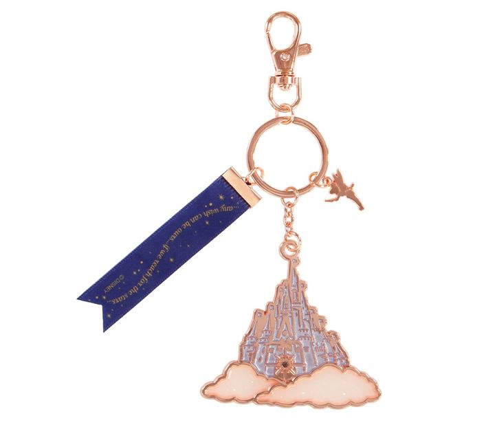 キャッチコピーがデザインされたバナーとティンカー・ベル、雲に浮かぶシンデレラ城の3つのチャーム付き。
