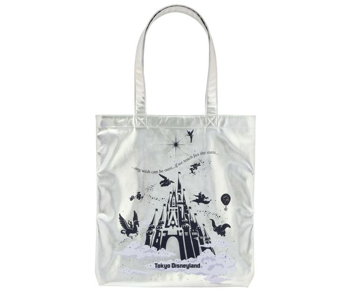 キラキラした素材が特徴的な縦型のトートバッグ。内側は夜空のようなデザインで、黒いシルエットでシンデレラ城やキャラクターが描かれています。