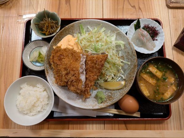 これは、なかなかないアジフライの定食ですね。お得ですね!メインの大アジフライに、大人のきんぴら、香の物、鯛のお造り、ごはん・お味噌汁・龍の玉子付きです。ごはん・お味噌汁・龍の玉子はおかわり自由だそうです。スゴいですね。しかもごはんは「土鍋ごはん」です!すごいですね。