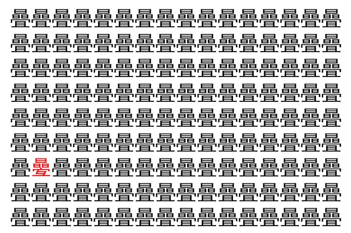 画像の中には、「曡」という漢字が縦に9行、横に16個並んでいます。 全部で144個となりますが・・・、そのうち1つは「異なる漢字」となってますよ!!