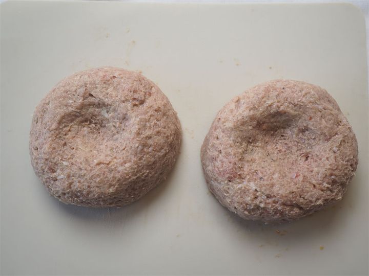 両手で交互にタネを打ち付けるような感覚で、空気を抜きながら円形に成形していきます。真ん中をへこませることで、膨らみすぎず、ハンバーグが割れにくくなるとのことです。