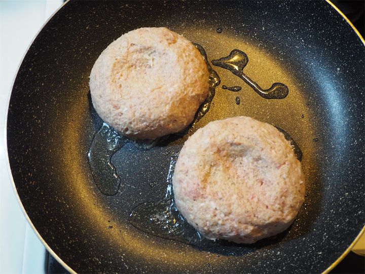 5. フライパンに油を引き、温めたら4を入れ、フタをして中火弱で蒸し焼きにしていく。片面4分を目安に両面を焼いていく。