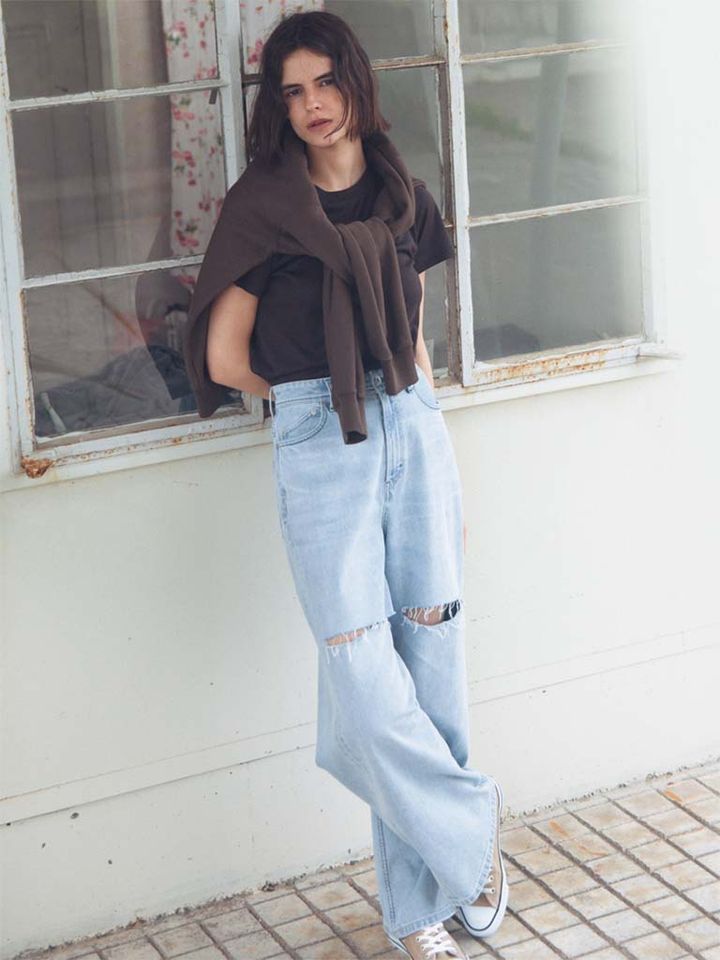 Tシャツなのにエレガントに着られる、ジャストめのサイジングと深みのあるブラウン。つまり気味のネックラインのおかげで、1枚でもシックに決まる。黒のように使えて、黒よりもやさしい色みならば、カジュアルなスタイリングも女性らしくやわらかい雰囲気に。