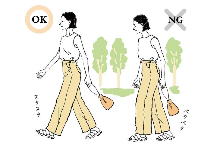足を前に出してペタペタ歩くと、前ももが主体となって働いてしまい、太くなりやすく。早歩きで後ろに蹴るように歩けば、背面も使うことができ、脚痩せのみならずヒップアップ効果も!