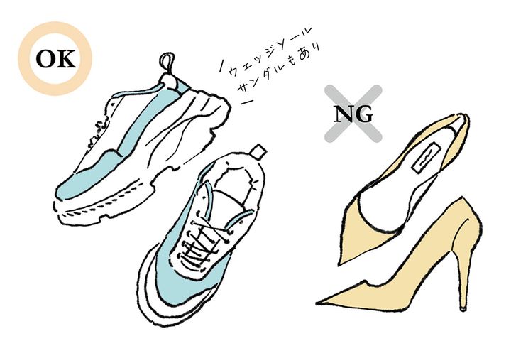 足首と足指が圧迫され、自由がきかず動かしにくいと足裏が上手く使えず、ふくらはぎが耐えて太くなり足首まで太く…。先が細くて幅が狭いハイヒールやパンプスは避けて。スニーカーがベスト!