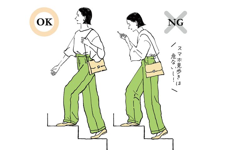 下を向いて階段を上っていると、背中が丸まって骨盤が後傾になります。この状態で脚を持ち上げる動作を繰り返すと、前ももへの負担が大きくなり太くなる要因になるので気をつけましょう。