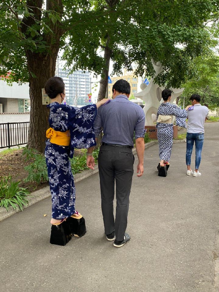 そして慣れない、花魁ならではの「外八文字」(高い下駄を履いて、足を大きく外に回しながら足を運ぶスタイル)の歩き方で、鼻緒がすれて痛いし、なんだか汗も止まらないし、ゴールがとっても遠く見えました...。