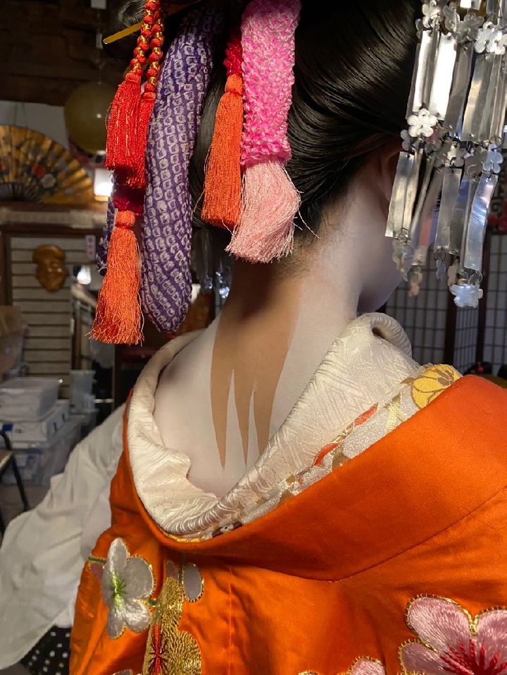 札幌の芸者衆は、うなじはいつも全部塗っているので(これも街によって違いますね)、この塗り方に慣れておらず…このパートだけお手伝いいただきました。ありがたや...。