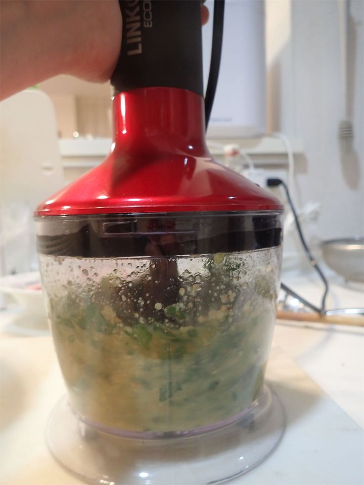 3. 数回に分けて葉を投入し、攪拌します。容器いっぱいに葉を入れないようにしてください。ミキサーに負荷がかかって熱が上がり、鮮やかな緑色が失われてしまいます。