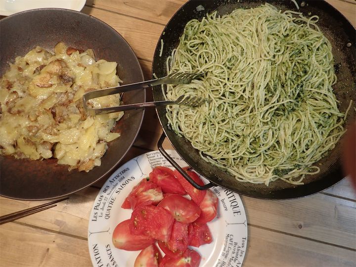 パスタのほかに「じゃがいものガレット」とトマトも。すべてわが家の畑でとれた野菜です。