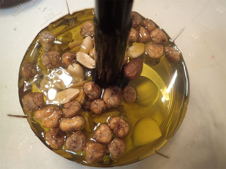 2. ミキサーにまずオリーブオイル、ナッツ、にんにくを入れてスイッチオン。