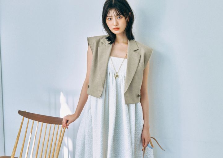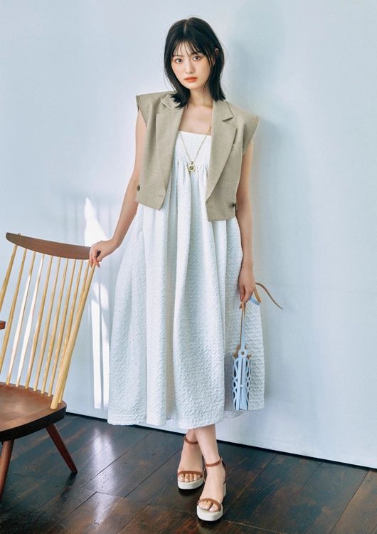 ジャカードキャミワンピース¥17,600/カロリナ グレイサー(ビームス) ジレ¥50,600/ソブ(フィルム) イヤリング¥3,300/mimi33(サンポークリエイト) ネックレス¥4,860/アビステ バッグ¥29,700/メアリ オル ターナ(ALDesign Inc.) サンダル¥9,900/CHARLES&KEITH JAPAN