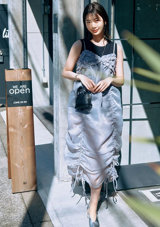 ギャザーキャミワンピース¥17,600/カロリナ グレイサー(ビームス) Tシャツ¥8,800/ミューニック(アンタイトル) ピアス¥20,900/マユ(マユ ショールーム) ブレスレット¥6,600/Hh( フォーティーンショールーム) バッグ¥1,990/神戸レタス パンプス¥16,500/ラベルエチュード