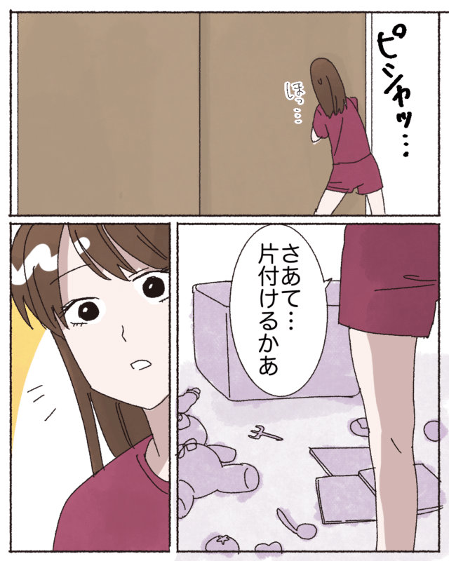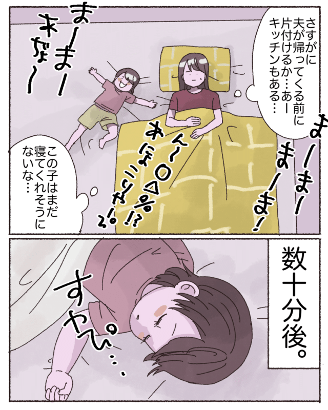 「さすがに夫が帰ってくる前に片付けるか・・・あーキッチンもある。この子はまだ寝てくれそうにないな・・・」夜、なかなか寝ない娘を数十分かけて寝かしつけた後、部屋を片付けることにしました。
