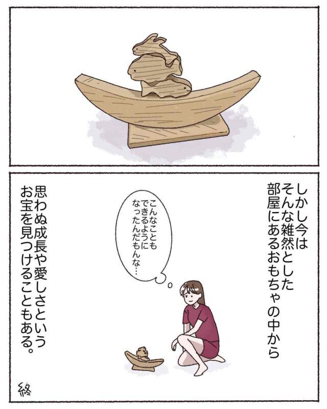 色々な形のピースを上手に積み上げてある木のおもちゃ。「こんなこともできるようになったんだもんな・・・」すっきりした部屋が好きだけれど、今はこんな雑然とした部屋にあるおもちゃの中から娘の思わぬ成長や愛しさというお宝を見つけることもある。