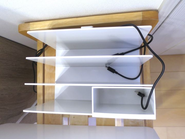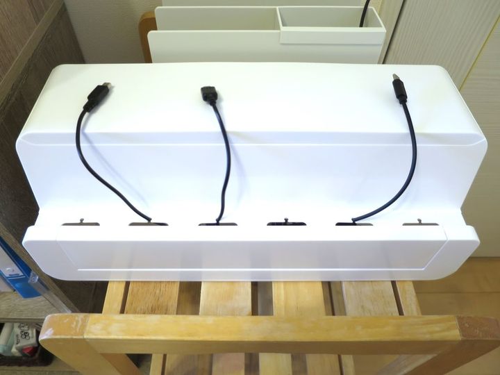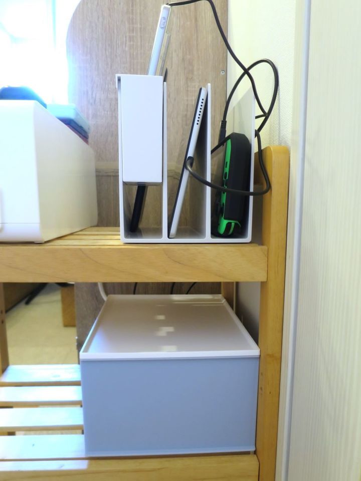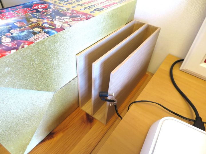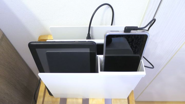 わが家で作った充電ステーションは、いずれも「仕切りスタンド+ケーブルボックス」という構造です。仕切りスタンドは、デバイスを置く定位置としての役割。ケーブルボックスは、電源タップと充電コード類をまとめて収納できるので、プラグ周辺にホコリがたまるのを防ぎ、見た目もスッキリさせることができます。