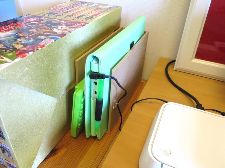 タブレットは立てることでスッキリと収納することができます。こちらも定位置ができたことで、子どもも自分で戻しやすくなったようです。