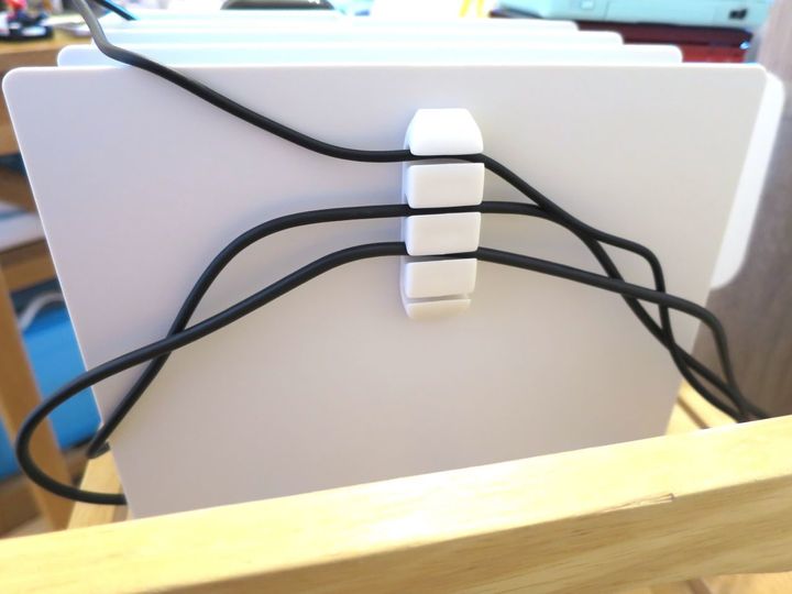 スタンドの側面には、充電ケーブルを誘導するためのケーブルクリップを貼り付けています。
