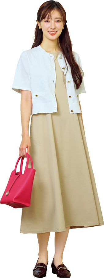 ふんわりゆれるフレアワンピはショートジャケットで腰位置をアップ