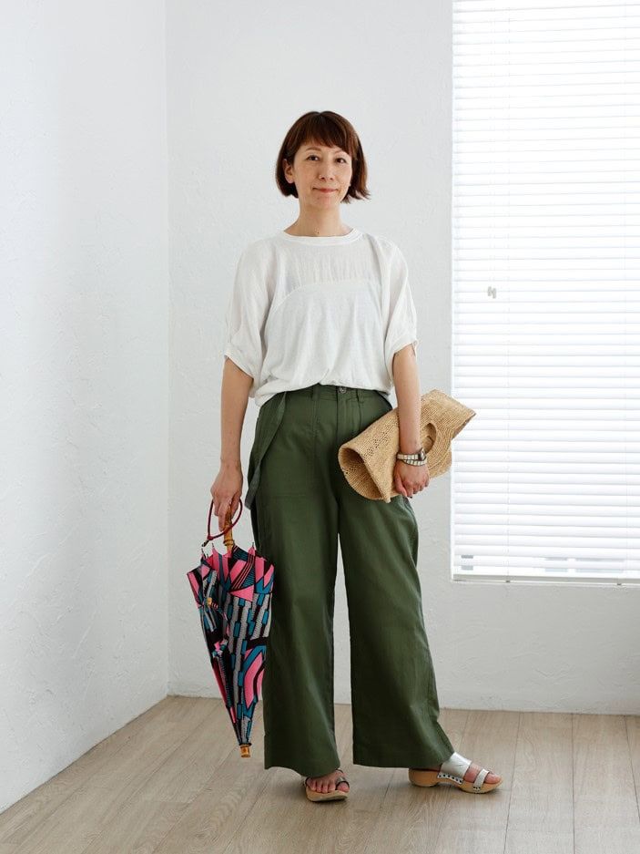 「夏のおしゃれは素材選びにこだわり、快適に過ごせるように意識しています。酷暑の今年は、プリントTシャツやリネンパンツを新調しました」。そんな多田さんがこの日着ていたのは、リネン素材のカットソーと綿麻のワイドパンツ。「カーキのパンツは、どんなアイテムとも合わせやすいのでひとつ持っておくと便利。着こなしのアレンジが楽しめるサスペンダーがポイントです」