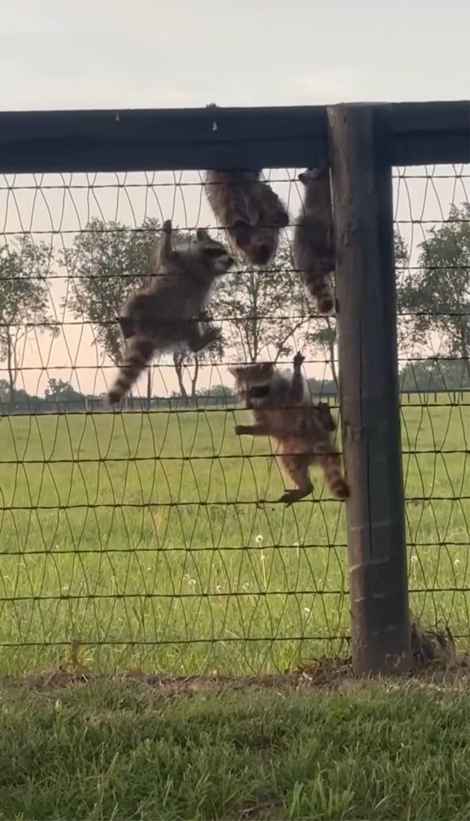 フェンスによじ登っているアライグマの赤ちゃんたち。