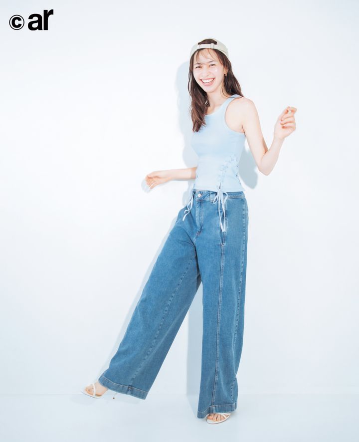 中条あやみ。ar9月号より タンクトップ¥ 8,910/シールームリン(シールームリン 神宮前店) デニム¥18,700/ラコステ(ラコステお客様センター) キ ャップ¥5,900/ビヨンド ザ バインズ(リディア) ピア ス¥11,000/ブリー レオン(ジャック・オブ・オール・トレーズ プレスルーム) ミュール/スタイリスト私物
