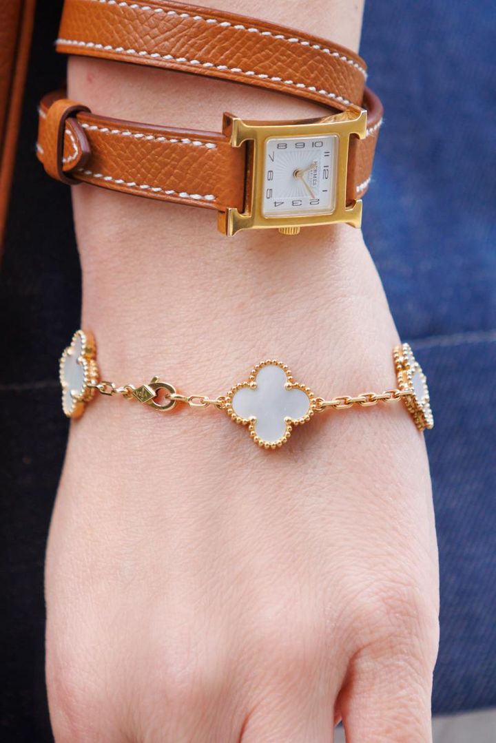 「ヴァンクリのブレスは単品でつけることもありますが、基本的には何かと一緒につけてボリュームを持たせ、コーデのポイントになるようにしています。アルハンブラ自体が甘めのデザインなので、エルメスのレザーベルトの時計を合わせて甘辛ミックスにして取り入れることが多いです」川下佳美さん・160㎝(主婦/5歳と3歳の男の子ママ)