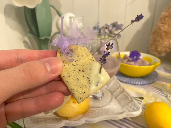 バスケットに入っている「ラベンダークッキー」はラベンダーの花束の形をしたシンプルなクッキー。サクッと食感が心地よく、バターの香りがほのかに感じられる馴染みのある味わいです。