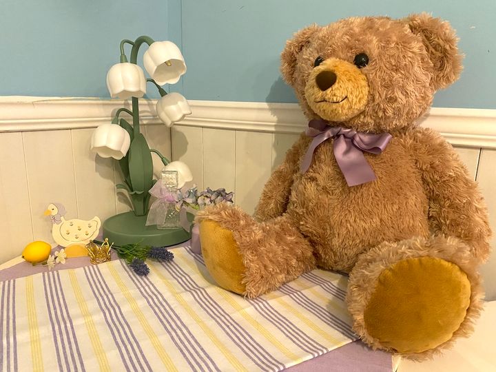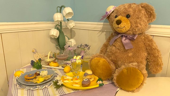 オーダーを終えると、まずはテーブルコーディネートからスタート。「みずいろの花」では自分好みのテーブルコーディネートができるのが特徴です。「アフタヌーンティー」をオーダーした場合、好きなアイテムとテーブルクロスを2つずつ、メニューに合わせた装飾品、大きなクマのぬいぐるみを使ってセッティングできます。