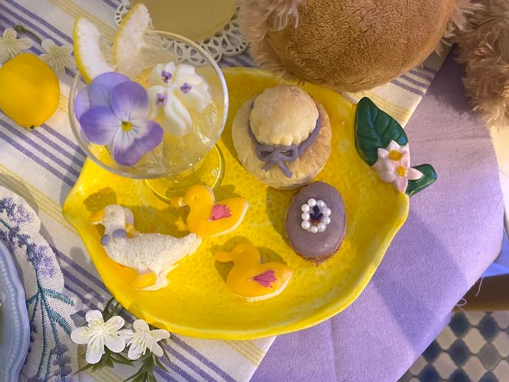 レモンの形をしたプレートには「アヒルの親子のサンドイッチ」、「麦わら帽子のミートパイ」、「マカロン」、「レモンゼリー」がラインアップ。