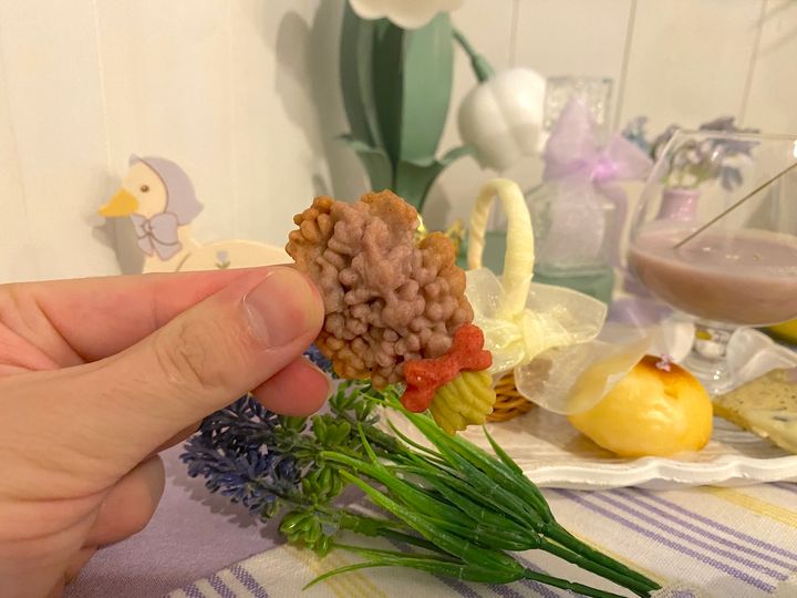バタフライピーで色付けした紫のマッシュポテトをサクサクのビスケットでサンドした「ポテトサンド」。表面にはラベンダーの花束がマッシュポテトで描かれています。ポテトの甘みとビスケットの塩気のバランスがよく、お客さんの人気が高いことから季節が変わってもよく登場するようです。