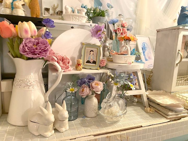 アイテム2つは店内の専用エリアから選ぶことができます。棚やテーブルに並べられたアイテムの中から自分が作りたいセッティングに合うものを選んでみて。今回はゴージャス感を取り入れるために王冠と華やかな花瓶をチョイスしました。