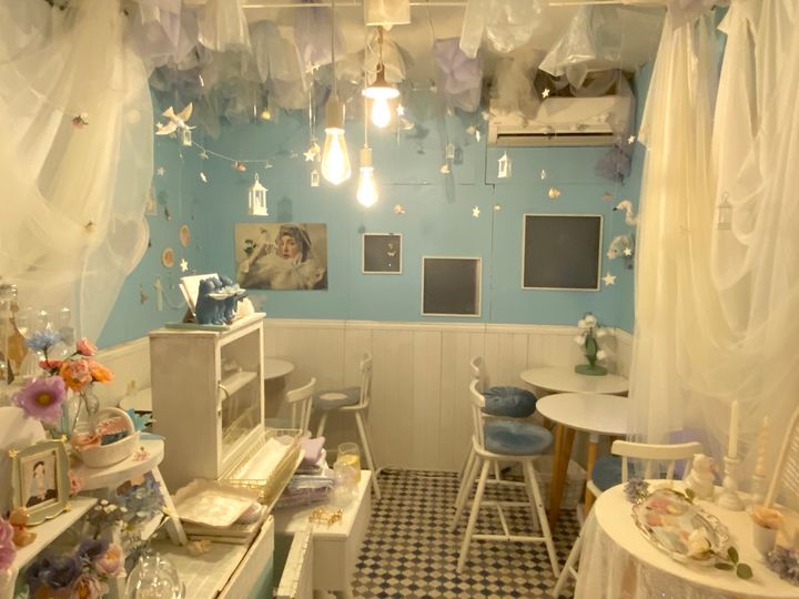 お店に足を踏み入れると、そこに広がるのはプリンセスのお部屋のような白と水色のツートンカラーのメルヘン空間。「大人の女性でもかわいいと思える」を大切にセレクトしたインテリアや小物などの装飾が店内のいたるところにあり、乙女心をくすぐります。昔からカメラを趣味にしていた店主さんが培った知識と経験を生かして、カメラでどこを切りとっても映える配色にしたそうです。店内にはテーブル席が3席のみで、1人1テーブルを利用する形になっています。