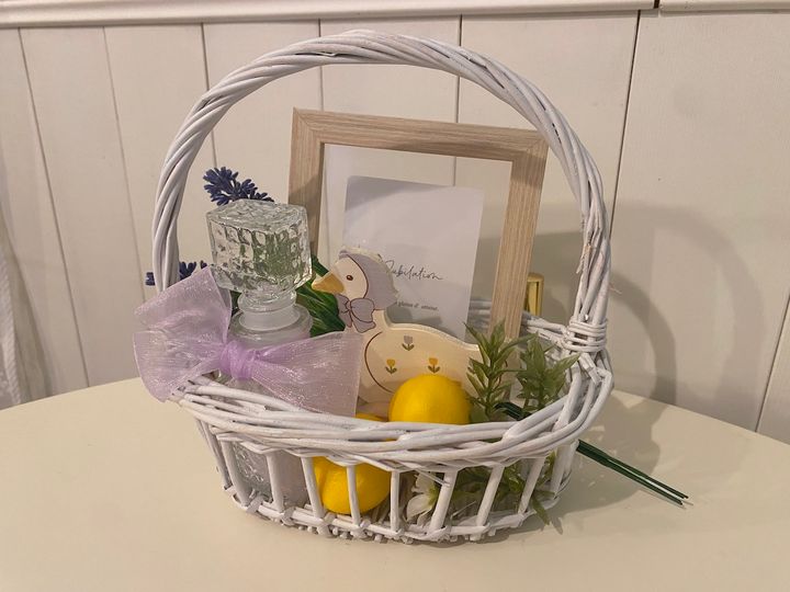 取材時はピクニックをイメージさせるカゴにメニューに合わせた装飾品が入っていて、アヒルやレモンなどの小物、お花や香水ビン、フォトスタンドという内容でした。