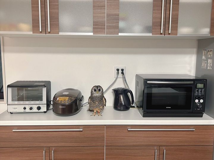 オーブントースターや炊飯器、電気ケトルに電子レンジなどが並ぶキッチン。 その真ん中にはアカアシモリフクロウの『かなた』ちゃんの姿が!