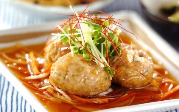 刻んだエビと野菜を混ぜ込んだ豚肉つくねは旨味たっぷりで美味。野菜が苦手でもこれならペロリと食べられそうですね。器に盛り付け、貝われ菜と糸赤唐辛子をのせれば涼やかな見た目に。