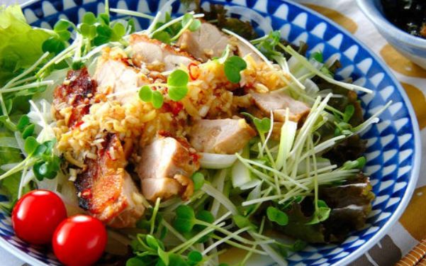 お皿に敷き詰めた野菜の上に鶏モモ肉をのせてサラダ風に仕上げた一品。鶏モモ肉はグリルでジューシーに焼き上げた後、南蛮ダレに漬けていきます。ショウガ入りのタレで、野菜もモリモリ食べられますよ。