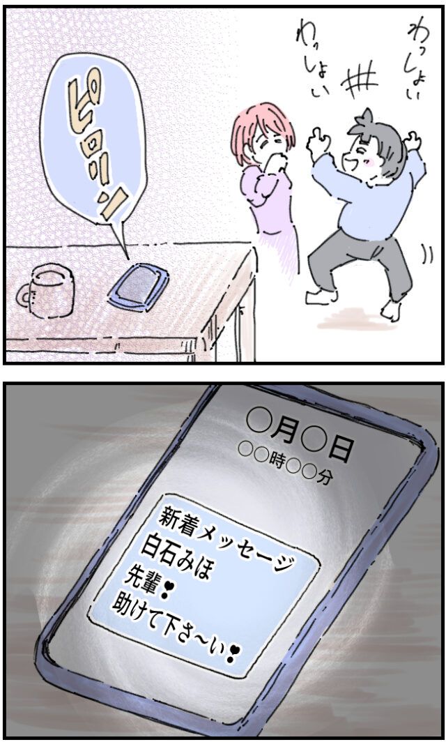 その後、「わっしょい!わっしょい!」と喜びを表現するいちろうさんとかおりさん。すると「ピロリン」スマホが鳴りました。その画面には「〇月〇日 新着メッセージ 白石みほ「先輩!助けてくださ~い!」と書かれていました。