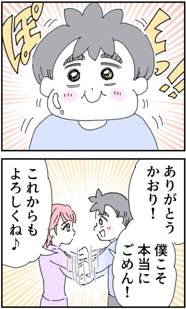 疲れ切って生気のなくなったような表情から一挙逆転!笑顔を浮かべると「ありがとうかおり!僕こそ本当にゴメン!」「これからもよろしくね」そう言うと、かおりさんの手を強く握りしめました。